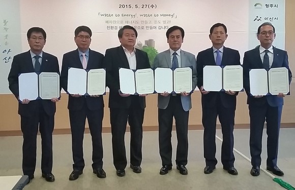 경남 양산시가 청주·아산·경주·영천시와 함께 충남 아산시 환경과학공원내 회의실에서 한국환경공단과 친환경에너지타운 조성사업 위·수탁 협약을 체결했다.