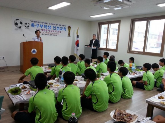 축구부 학생들을 대상으로“신체만 건강한 선수가 아닌 정신도 건강한 선수로 육성”하자는 취지로 지난 6월 11일(목) 축구부 생활관에서 이범태 교장 선생님을 비롯한 전 교원과 축구부 학생(30명)들이 저녁 식사(삼겹살 파티)를 하면서 밥상머리 교육을 실시하였다.