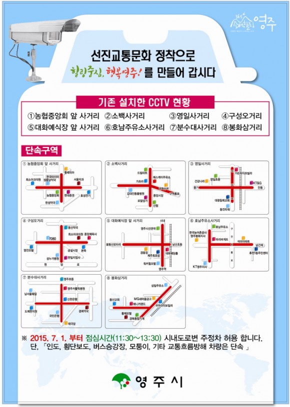 영주시에서는 상습 불법주정차지역의 원활한 차량소통과 안전하고 쾌적한 교통문화 정착을 위해「휴천동 육거리」,「영주역 앞」,「꽃동산로터리」,「중앙약국 앞 사거리」,「광시당 앞 사거리」에 불법주정차 무인단속카메라(CCTV)를 설치하고, 2015년 6월말까지 계도기간을 거쳐 2015년 7월 1일부터 본격적으로 단속을 실시한다.