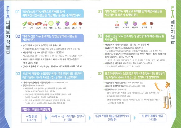 또한, 폐업 지원은 FTA 이행에 따라 과수‧축산 등 품목의 재배‧사육을 계속하는 것이 곤란하다고 인정되는 품목에 대해 농업인등이 폐업을 희망하는 경우, 3년간의 순수익을 지원해주는 제도이다. 폐업지원 대상품목은 체리, 노지포도, 시설포도, 닭고기, 밤, 5개 품목이다.