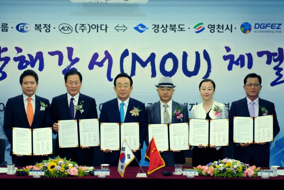|  | | | ⓒ (주)영남도민일보 | | 중국기업인 금중그룹․대련복정 및 한국의 ㈜아다는 13일 오후 대구경북경제자유구역청에서 김관용 경상북도지사, 김영석 영천시장, 도건우 대구경북경제자유구역청장과 투자양해각서(MOU)를 체결하였다. 이들 3개 기업은 합작으로 대구경북경제자유구역인 영천첨단부품소재산업지구에 2015년부터 2017년까지 2천4백만달러를 투자하여 자동차 차체부품을 생산할 계획이다.