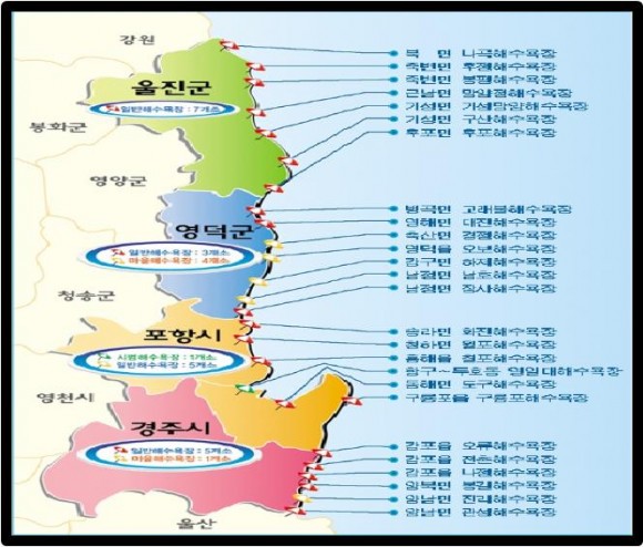 포항시 영일대해수욕장이 6월 8일 조기 개장했고, 칠포, 월포, 화진, 구룡포, 도구해수욕장은 6월 27일, 경주시 관내 해수욕장 6개소는 7월 10일에 개장해 운영 중이며, 영덕군 7개소와 울진군 7개소는 7월 17일개장해 운영에 들어간다.