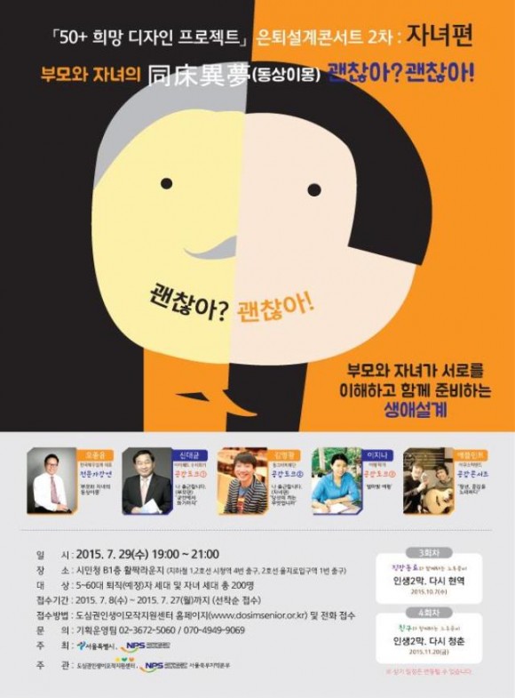 시는 국민연금공단과 함께 오는 7월 29일(수) 저녁 7시부터 서울특별시청 지하 1층 ‘시민청 활짝라운지’에서 「은퇴설계콘서트 시즌2 (자녀편)」를 개최한다고 밝혔다.
