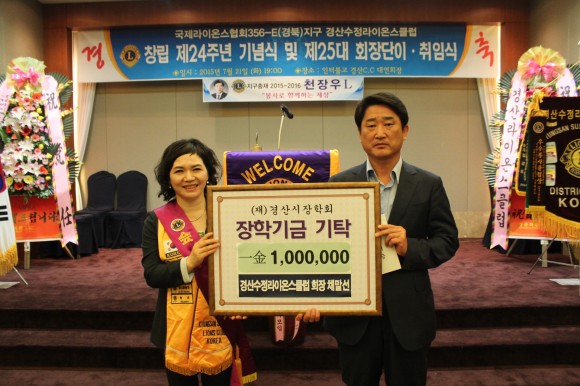 경산수정라이온스 신임회장. 취임식에서 장학기금 100만원 기탁
