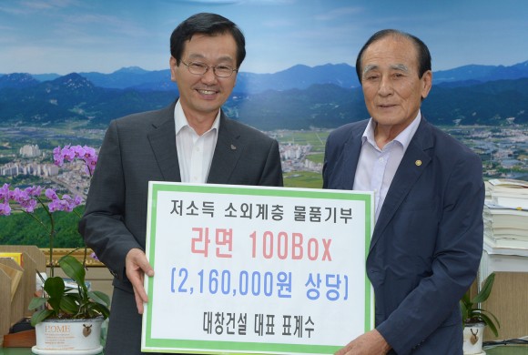 |  | | | ⓒ (주)영남도민일보 | | 표계수 대창건설 대표가 23일 라면 100박스(216만원 상당)를 저소득 소외계층 및 자연재해 구호물품으로 거창군(군수 이홍기)에 기탁했다.