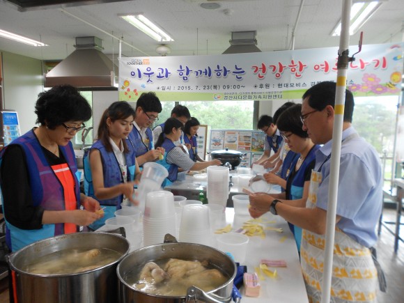 다문화가족과 내국인으로 구성된 “다함께 나눔봉사단” 회원과 현대모비스 경북부품사업소(소장 김주홍) 직원 등 15여명은 오전 9시부터 경산시보건소 조리실에서 여름보양식(영양삼계탕) 120인분을 만들어 관내 사회복지관, 아동센터, 홀로어르신, 다문화가정, 북한이탈주민 등 소외되고 어려운 이웃들에게 직접 포장 배달하였다.