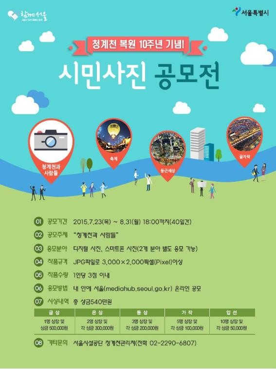 청계천 시민 사진공모전은 ‘디지털 사진’과 ‘스마트폰 사진’ 부문으로 나눠져 진행되며 내·외국인 누구나 참여할 수 있다. 공모주제는 ‘청계천과 사람들’로 아름다운 청계천에서의 추억을 담은 작품 중 국내외 미 발표작에 한해 출품 가능하다.