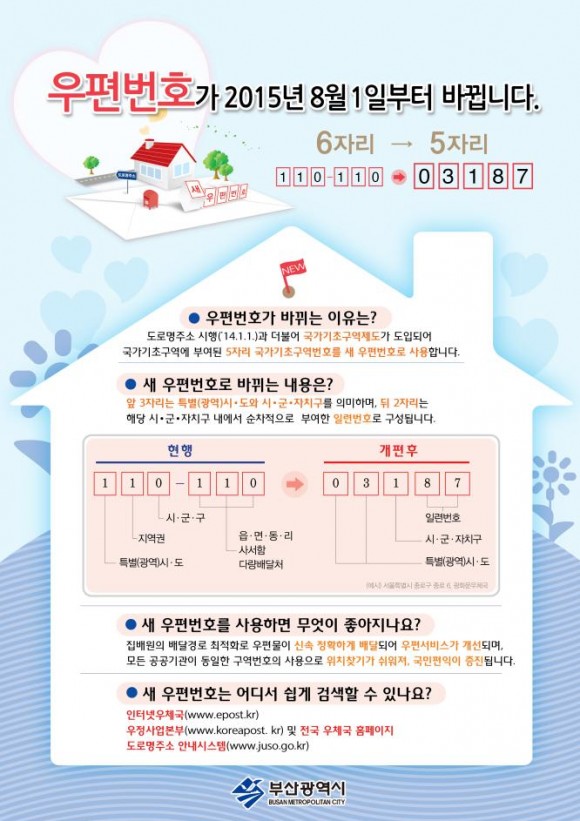아울러 이번에 새 우편번호로 바뀌는 이유는 지난 2014년 1월 1일 도로명주소 시행과 더불어 국가기초구역제도가 도입돼 국가기초구역에 부여된 5자리번호를 새 우편번호로 사용하게 되는 것이다.