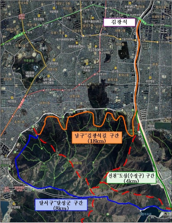 이번 사업은 앞산의 풍부한 산림자원과 신천의 수변 공간 및 전국적으로 유명세를 타고 있는 김광석거리를 생태탐방로로 연계해, 시민들에게 새로운 힐링공간을 제공하고, 관광명소로 만들기 위한 대구시의 야심찬 계획이다.