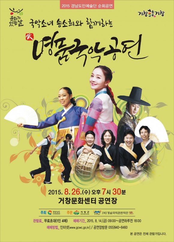 |  | | | ⓒ (주)영남도민일보 | | 거창군(군수 이홍기)은 오는 8월 26일(수) 19:30부터 거창문화센터 공연장에서 도민예술단 순회공연 “국악소녀 송소희와 함께하는 명품국악공연“이 열린다. 도민예술단은 도민들의 문화 향유 기회 확대를 위해 경상남도에서 도내 문화․예술단체를 공모 선정하여 시․군을 순회하며 공연하는 사업으로 올해에는 거창군을 비롯한 14개 시군에서 15회에 걸쳐 공연이 진행된다. 이번 도민예술단 거창 순회공연은 경상남도 주최, 거창군과 (사)경남국악관현악단 “휴”(단장 송철민)가 주관하며 천상의 소리 국악소녀 송소희, 대통령상 수상에 빛나는 사물광대와 경기민요의 고금성, 판소리의 김수경, 탭댄스의 리드미스트 등 전통과 현대를 넘나드는 다양한 출연진이 함께한다.