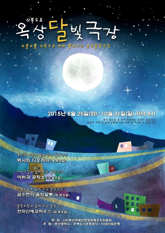 |  | | | ⓒ (주)영남도민일보 | | (사)부산국제단편영화제조직위원회가 주관하는 ‘산복도로 옥상달빛극장’이 8월 25일 화요일 중구 ‘금수현의 음악살롱’에서 첫 상영을 한다. 8월25일부터 10월 31일까지 중구 ‘금수현의 음악살롱’, ‘역사의 디오라마’, 동구 ‘이바구공작소, 서구 ’천마산에코하우스‘에서 월요일, 우천, 추석연휴를 제외한 매일 저녁 8시에 단편·독립영화제 수상작 및 상업영화 등이 상영된다.