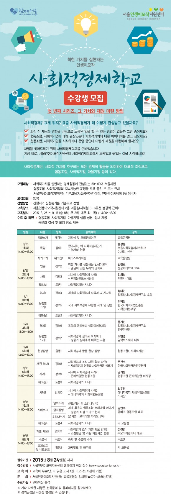 사회적 경제학교는 8월 25일부터 9월 15일까지 주 2회, 총 8회차로 진행될 예정이며 모집대상은 협동조합, 사회적기업, 마을기업에 관심있는 50~60대 서울시민 20명이다.
