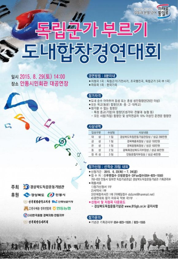 |  | | | ⓒ (주)영남도민일보 | | 경상북도독립운동기념관(관장 김희곤)은 광복 70주년 맞는 올해 여러 특별 행사를 펼쳤다. 그 가운데 오는 8월 29일(토) 오후 2시, 안동시민회관 대공연장에서 지역에서는 처음으로 독립군가를 직접 불러 나라사랑의 마음을 다지는 도내 합창경연대회를 개최한다.