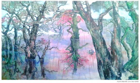 특히, 주왕산 국립공원의 웅장함을 한 눈에 볼 수 있는 대작 “주왕산 일주(2,090×98cm, 2008년)”, 뛰어난 예술적 감각으로 염색천에 조화롭게 그려놓은 주산지와 주왕산 일대 폭포는 그림 애호가들의 발길을 멈추게 한다.