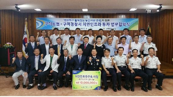 |  | | | ⓒ (주)영남도민일보 | | 구미경찰서(서장 이준식)는 9. 1.(화) 구미농협 대회의실에서 구미농협과 치안인프라 확충에 투자하는 업무협약을 체결하고, 구미농협의 치안인프라 구축 기금(1천만원)으로 안전하고 활력 있는 지역사회를 조성키로 하였다.