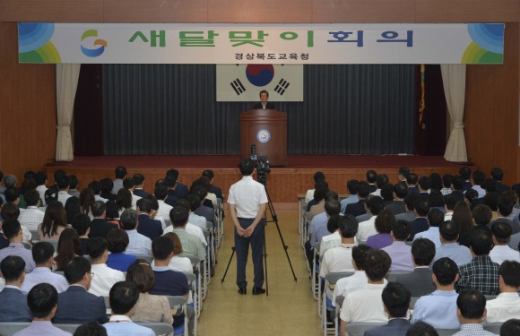 |  | | | ⓒ (주)영남도민일보 | | 경상북도교육청(교육감 이영우)은 9월 1일 별관 대회의실에서 전 직원(350여명)이 참석한 가운데 9월 새달맞이 회의를 개최하였다.