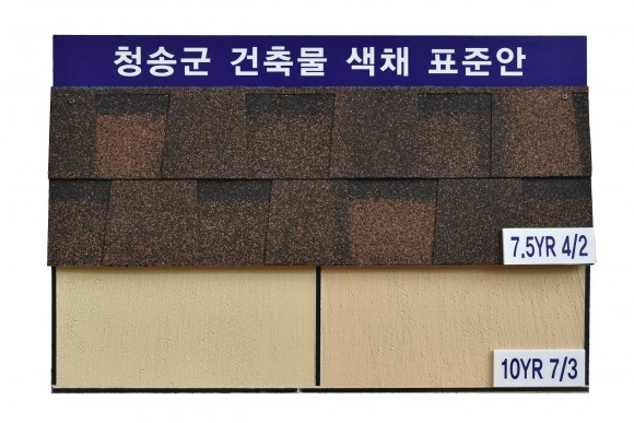 이번에 청송군 건축물 색채표준안과 적용 모형을 읍면사무소, 건축사 사무소 등에 비치하고 적극적인 홍보에 나서고 있다. 주택이나 창고 등 각종 건축물 신․개축시 지붕의 색채는 갈색계통(7.5YR 4/2), 벽체색은 베이지색계통(10YR 7/3)로 권장에 나서고 있으며 아울러, 간판은 바탕색을 갈색계통(10YR 4/1, 5YR 3/1), 강조색은 베이지색계통(10YR 8.5/0.5, N9)으로 권장하고 있다.
