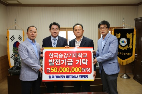 |  | | | ⓒ (주)영남도민일보 | | 한국승강기대학교(총장 김천영)는 성우ENC(주) 김정동 대표가 2일 학교 발전기금으로 5천만원을 전달했다고 밝혔다. 이번 기부는 최근 취임한 김천영 총장이 대학 발전을 위해 유관 업계에서 기부 활성화를 적극 유도한 결실로 보여 지며, 기부금은 대학의 노후시설 보완과 장학금으로 사용될 예정이다.