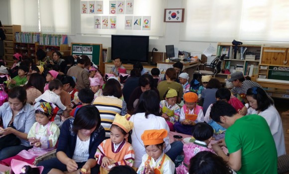 우리나라 단원에 맞추어 반별로 이루어진 자녀의 수업을 참관 하는 학부모님들은 유아의 학습태도, 발표참여도, 주의집중 등을 관찰하면서 자녀가 수업하는 모습을 진지하게 참관하였다. 참관을 마친 학부모님들은 곱게 한복을 차려 입은 자녀들과 송편을 빚으며 마음을 나누었다.