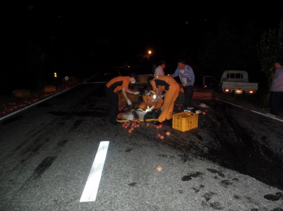 이번 사고는 사과박스를 싣고 가던 경운기와 포토(1톤 화물) 차량이 충돌한 교통사고로 경운기 운전석과 그 옆에 타던 노부부가 도로에 추락하여 일어난 사고로 현장 도착 당시 요구조자 진모씨(남,74세)와 요구조자 장모씨(여,72세)가 크게 다쳐 신속히 응급처치 후 안동병원으로 긴급 이송했다.