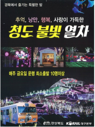 이번 “청도불빛열차” 상품은 매주 금요일(19:20) 동대구역을 출발, ‘감와인’으로 유명한 청도 와인터널과 어둠이 내린 밤하늘을 배경으로 펼쳐지는 ‘불빛의 향연’프로방스 포토랜드 등을 관람하는 코스로 이루어졌으며, 열차 내부에 야광조명을 설치하는 등 야간열차의 정취와 낭만을 흠뻑 느낄 수 있도록 구성했다.