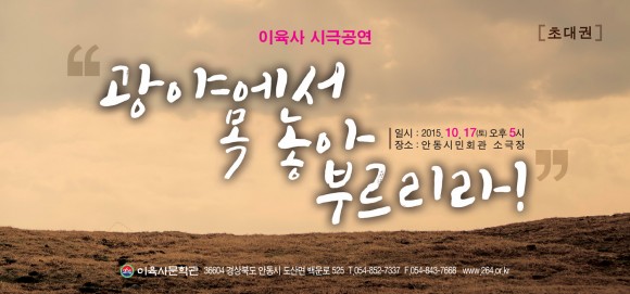 창작극단 <상상두목>의 대표로 있는 최치언 작가가 극을 직접 쓰고 연출한다. 시극 <광야에서 목놓아 부르리라>의 시놉시스는 이렇게 시작된다. “독서의 계절 가을, 고등학생 한민은 어느 날 돌연 가출을 한다. 하지만 담임선생님 준혁은 가출한 한민을 묵묵히 기다리기만 할 뿐 어떤 조치도 취하지 않는다.