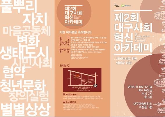 대구시와 대구사회연구소(소장 엄창옥)는「제2회 대구사회 혁신아카데미」를 대구예술발전소(수창홀)에서 11월 5일부터 12월 4일까지 매주 목요일 19시부터 21시 30분까지 운영한다.