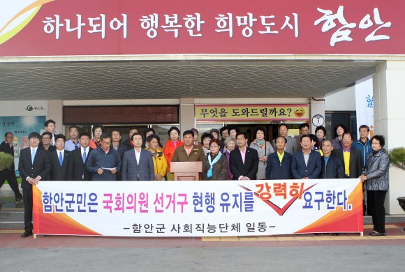 이날 오후 2시 함안군청 현관에서 새마을운동단체, 바르게살기단체, 자유총연맹단체, 함안청년회의소 등 각급 단체 및 군민 100여 명이 집결한 가운데 박 지회장은 성명서를 통해 “함안·의령·합천 군민의 정서와 지역 특성을 무시하고 인구 편차를 줄이는 산술적 평등만 고려해서 선거구를 결정 한다면 이는 도농격차를 심화시키고 전국 균형발전을 저해하는 결과를 가져 올 것”이라며 현행 선거구 조정을 결사반대했다.