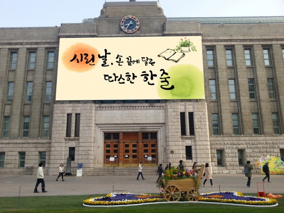 11월2일 아침, 서울도서관 정문에 걸리는 글귀는 ‘시린날, 손 끝에 닿은 따스한 한 줄’이다. 이번 문안은 서울시가 ‘독서와 사색에 얽힌 이야기_스마트 시대에 변하지 않는 가치’를 주제로 공모를 진행하여 우수작으로 선정된 시민 안상선(남‧30), 최예진(여‧22) 씨의 작품이 합쳐진 글귀이다. 서울시가 지난 10월7일부터 14일까지 총 8일간 공모를 진행한 꿈새김판 문안공모에 최종 481건의 작품이 접수되었으며 이중 안상선, 최예진 씨가 공동 우수상을 수상했다.