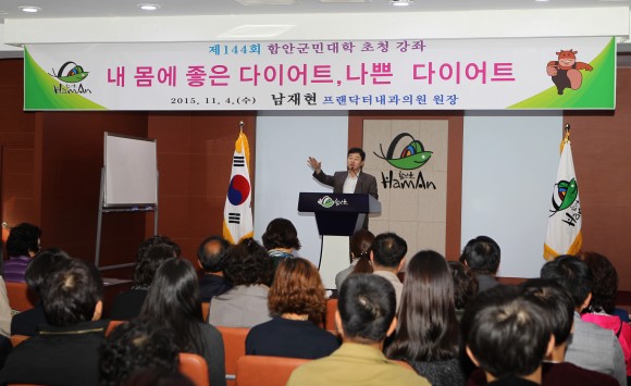 |  | | | ⓒ (주)영남도민일보 | | [영남도민일보] 조은서 기자 = 함안군(군수 차정섭)은 지난 4일 오후 2시 30분, 군청 3층 회의실에서 주민, 공무원 등 200여 명이 참석한 가운데 남재현 프렌닥터내과의원 원장을 초청해 ‘내 몸에 좋은 다이어트, 나쁜 다이어트’ 라는 주제로 제144회 함안군민대학 강좌를 개최했다.