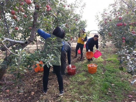 이날 통장협의회장 등 20여명이 농촌일손이 부족한 임하면 신덕리 김용걸 씨 농가를 찾아 사과 따기 등의 작업을 도왔다.