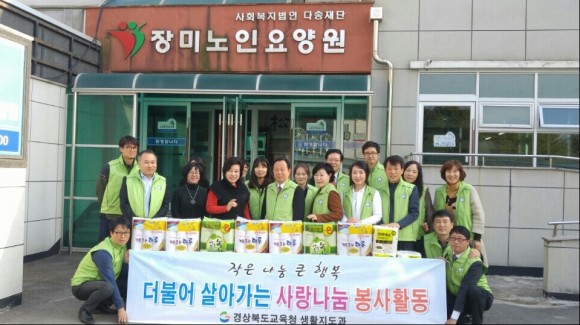 |  | | | ⓒ (주)영남도민일보 | | [영남도민일보] 권기환 기자 = 경상북도교육청(교육감 이영우) 생활지도과 직원 16명은 11월 5일 사회복지 재활전문 프로그램을 배우며 중증노인성 질병을 치료하고 계시는 98명의 어르신들이 생활하는 장미노인요양원(칠곡군 왜관읍)을 방문해 위문품을 전달하고 봉사활동을 실시했다.