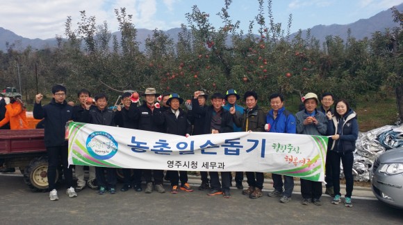 |  | | | ⓒ (주)영남도민일보 | | [영남도민일보] 김창기 기자 = 영주시 세무과 직원 15명은 지난 11. 5일 일손부족으로 어려움을 겪고 있는 농가를 찾아 농촌일손돕기에 나섰다.