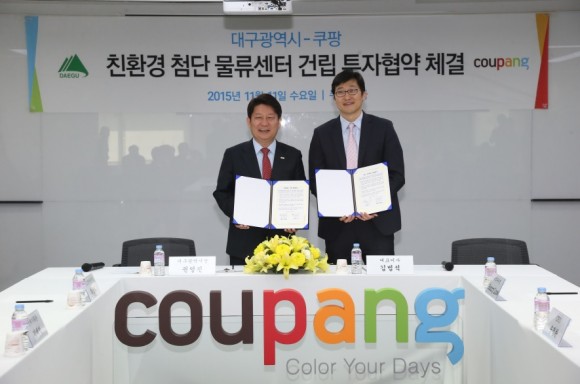 대구시는 11월 11일(수) 오전 11시, 서울 쿠팡 본사(서울 강남구 테헤란로501, 경암빌딩)에서 권영진 대구광역시장과 쿠팡 김범석 대표 등 책임 관계자가 참석한 가운데 (쿠팡)친환경 첨단 물류센터 건립을 위한 투자 협약을 체결했다.