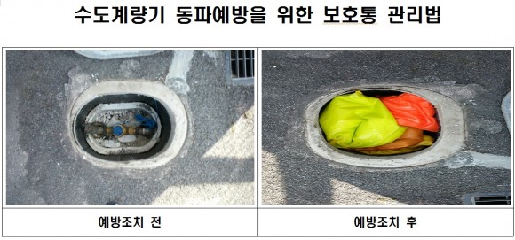 겨울철 수도시설의 동파사고 예방을 위해서는 계량기 보호통 안에 헌옷, 수건 등의 보온재를 넣어두고, 내부로 유입되는 찬 공기를 차단하기 위해 외부는 테이프로 밀폐시켜 찬 공기가 스며들지 않도록 해야 하며, 마당 및 화장실 등의 노출된 수도관은 보온재로 감싸줄 것을 당부했다.