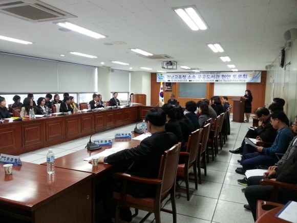 |  | | | ⓒ (주)영남도민일보 | | [영남도민일보] 최태성 기자 = 경남교육청(교육감 박종훈)은 11일 경남교육연구정보원 대회의실에서 교육청 소속 24개 공공도서관장과 직원이 참여하는 공공도서관 현안토론회를 개최했다. 이번 토론회는 ‘교육감! 공공도서관장과 미래를 읽다’라는 슬로건 아래 대통령 소속 도서관정보정책위원회에서 추진하고 있는 공립 공공도서관 행정체계 일원화에 대해 공공도서관에 근무하는 사서들의 의견을 듣고 도서관이 나아가야 할 방향 정립을 위해 마련했다.