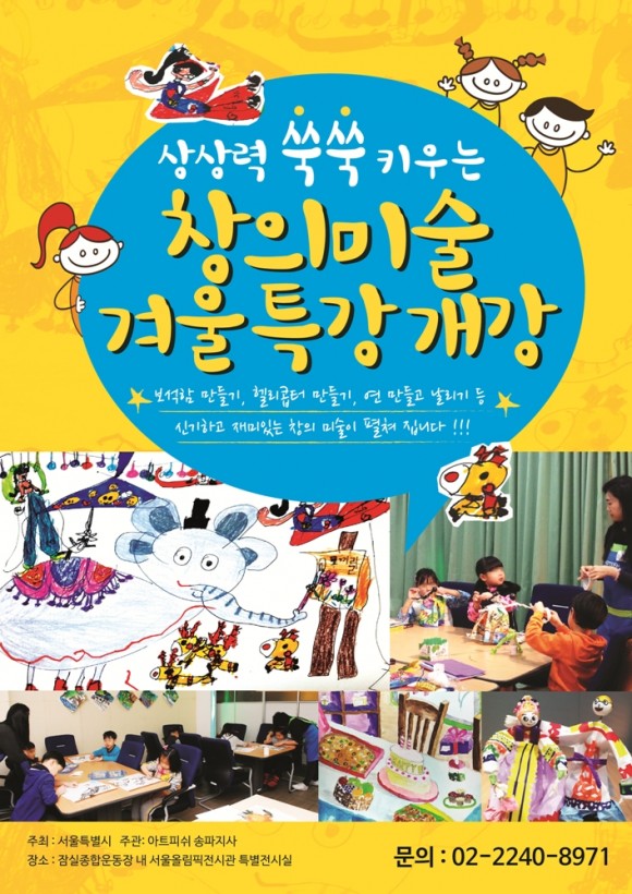 |  | | | ⓒ (주)영남도민일보 | | [영남도민일보] 이남희 기자 = 울특별시체육시설관리사업소는 오는 12월 5일 부터 내년 1월 31일 까지 유아 및 초등학생 어린이들을 대상으로 ‘함께서울 창의미술특강’을 운영한다고 13일(금) 밝혔다.