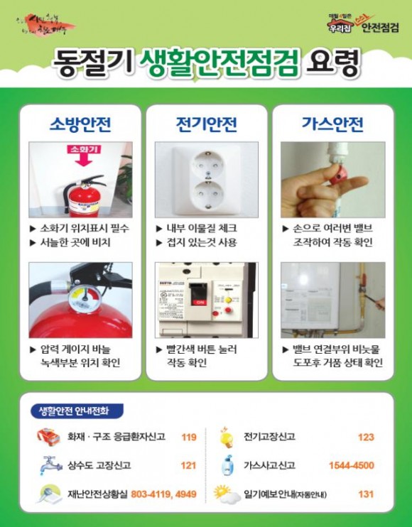 독거노인생활관리사는 11월 23일부터 12월 18일까지 독거노인 9,483세대를 개별 방문해 △소화기 비치 및 가스압력상태 △가전제품(전기장판, 전기밥솥 등) 작동여부 △누전차단기 등 전기제품 사용상태 △가스밸브 작동상태와 누출여부 등에 대해 생활안전점검을 실시한다. 점검 시 발견한 안전사고 위험요인 중 긴급한 사항은 기동안전점검단으로 신고해 위험요인을 제거한다.