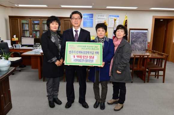 |  | | | ⓒ (주)영남도민일보 | | [영남도민일보] 김창기 기자 = (사)한국여성농업인영주시연합회(회장 안순희)는 지난 10월 4일부터 11일까지 풍기읍 남원천 둔치에서 개최된 2015 영주풍기인삼축제에서 “1,000원의행복”이란 코너를 운영하여 판매행사를 통한 수익금 1백만원을 11월 13일 시장실에서 영주시인재육성장학회(이사장 장욱현) 장학금으로 기탁하여 눈길을 끌었다. (사)한국여성농업인영주시연합회는 19개 읍면동여성농업인으로 구성되어 여성농업인의 자질향상과 독거노인, 노인요양시설 등을 방문하여 봉사활동을 해 오면서 이번 2015 영주 풍기인삼축제에 8일 동안 인삼튀김, 인삼우유, 영주쌀떡볶기 등 판매행사로 얻은 수익금 일부를 뜻 깊은 곳에 쓰고자 100만원을 영주시인재육성장학회에 기탁하게 되었다.
