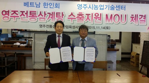 |  | | | ⓒ (주)영남도민일보 | | [영남도민일보] 김창기 기자 = 영주시의 우수 먹거리인 삼계탕이 본격적으로 해외에 진출할 교두보를 확보하였다. 영주시는 11월 14일 베트남 호치민시에서 영주전통삼계탕산업육성사업단(단장 송인홍)과 베트남 한인회(회장 이충근)간 영주삼계탕 수출 및 지원에 관한 업무협약(MOU)을 체결하고 상호 적극 협력하여 추진하기로 하였다.