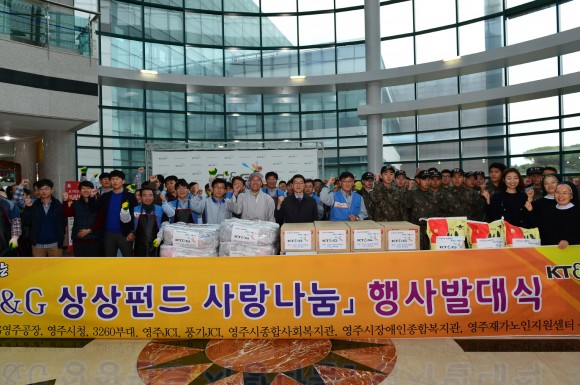「 KT&G 상상펀드 」는 임직원들이 모은 기금으로 소외계층에게 생필뭄을 지원하고 사업으로, 이날 행사에는 김 대영 공장장을 비롯한 KT&G 영주공장 임직원, 3260부대, 영주JCI, 풍기 JCI 등 8개기관 150여명이 참여 하였다.