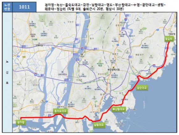 |  | | | ⓒ (주)영남도민일보 | | [영남도민일보] 최교열 기자 = 부산시는 지난 10월 19일에 확정한 노선개편계획에 따라 신설되는 해안일주도로 직통노선(1011번)의 주요대교 구간(광안대교~부산항대교~남항대교~을숙도대교)을 직접 좌석버스를 이용, 11월 24일 사전 시범운행 시행한다고 밝혔다.
