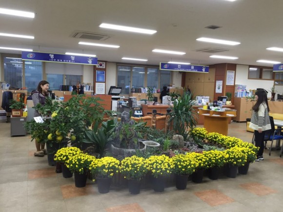 면사무소를 방문하면 출입구 계단을 따라 꽃양배추가, 청사 정문 양옆으로는 가을을 머금고 만개한 국화가 민원인들을 반겨주고 있다. 사무실 안에 들어서면 실내 정원을 둘러싸고 있는 국화들 옆에는 주민들이 자발적으로 기증한 유자나무에서 유자열매가 노랗게 익어가고 있고 또한, 열대과일 파파야가 싱싱한 푸름으로 민원인들 눈을 즐겁게 하고 있다.