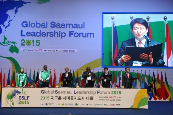 11월 25일(수), 지구촌 새마을 지도자 대회에서 권영진 대구시장과 정종섭 행정자치부 장관, 새마을 지도자 등이 2015 대구선언을 공동 발표했다.