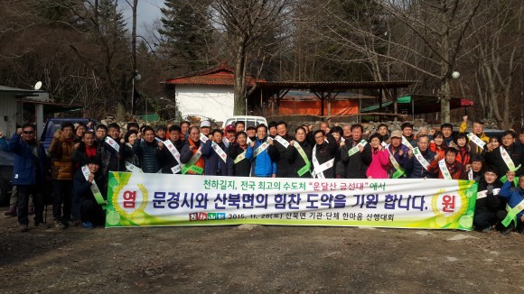 |  | | | ⓒ (주)영남도민일보 | | [영남도민일보] 김옥순 기자 = 산북면개발자문위원회(위원장 김욱)는2015경북문경 세계군인체육대회 성공개최를 다시한번 기념하고 아울러 문화산촌 산북면의 화합과 힘찬 도약의 계기를 마련하기 위해 지난28일 운달산금선대에서'산북면 기관·단체 한마음 산행대회'를 성황리에개최 했다. 이날은 쌀쌀한 날씨에도 불구하고 고윤환 문경시장,고우현 도의원,권영하,김인호시의원,각급 기관·단체장과 이장 등60여명이 참가 했다. 먼저 김용계곡입구에서 산불예방 캠페인을 실시한 후에 운달산 김용사에서 화장암 그리고 천하명당 이자 전국 최고의수도처로 손꼽히는‘금선대’까지를 산행코스로 정해 참가자들이 서로의 관심사와 함께 지역의 화합과 발전을 주제로 정겨운 대화를 함께 나누는 소중한 소통의 시간이 되었고,금선대에 도착해서는문경시와 산북면의 힘찬 도약을 다함께 염원하며 기념촬영을 했다. 고윤환 문경시장은“오늘 함께한 운달산 금선대를 방문객의 접근성이 용이하도록 개발·복원하여 전국 으뜸가는 기도도량,문화관광 자원으로 만들겠다”고 말했고,김승원 산북면장,김욱 개발자문위원장 등 행사참가자 모두는 일제히 환영의 박수로 화답 했다.