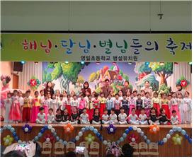 |  | | | ⓒ (주)영남도민일보 | [영남도민일보] 김창기 기자 = 영일초등학교병설유치원(원장 조시박)은 2015년 11월27일 오후3시 서솔관에서 해님,달님,별님유아 59명의 귀염둥이들의 학예회를 하였습니다. 유치원에서 틈틈이 배운 오카리나, 팬플룻, 작은북을 불고 두드리면서 “끼”자랑을 하였으며 고전무용과 전래동요,부채춤을 통해 유아들이 우리 전통문화와 예술에 대한 관심과 호기심을 가지는 계기가 되었으며 댄스와 발레를 통해 예술활동에 참여하여 창의적으로 표현하는 활동이 되었다. 해님반 송민성 어머니는 다양한 학예회 프로그램과 유아들이 친구와 함께 하는 여러 가지 활동을 통해 공동체와 협력활동을 배워 창의.인성교육에 밑바탕이 되는 것 같다고 하였다. 학예회를 통해 유아들은 다양한 활동을 창의적으로 표현해 볼 수 있는 기회가 되었고 학부모들은 1년동안 몸과 마음이 많이 자란 유아들을 보며 우리 유치원 교육 운영에 만족해하고 신뢰하는 계기가 된 것 같다.