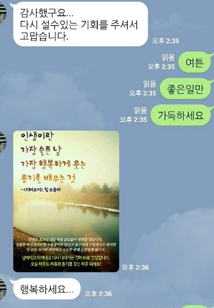 “감사했구요... 다시 설수있는 기회를 주셔서 고맙습니다.” 메신저를 받은 사회복지담당은 “복지공무원으로서 일하면서 어려운 처지에 있는 분들에게 도움을 드리고 감사인사를 들을 때 가장 보람을 느낀다.” 라고 말을 끝냈다.