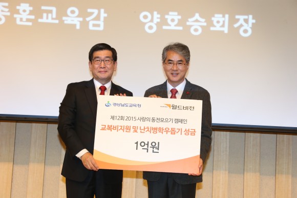 도교육청에 따르면 월드비전 경남지부 주관으로 7일 오후 3시 창원과학기술원에서 지역사회 복지관계자 및 지자체, 교육복지사 등 200여명이 참석한 가운데 비전지원 사업성과 보고회가 열렸다. 이날 행사에서 월드비전 경남지부는 2016년도 150명 학생 선정에 따른 2억5,800만원의 지원금을 박종훈교육감에게 전달했으며 제12회 월드비전 사랑의 동전모으기 캠페인 성금 1억원도 함께 전달해 교복 및 난치병 학우돕기에 사용될 예정이다.