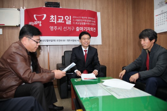 지난 12월 10일 오전11시 영주시청 기자실에서 최교일 전 중앙지검장이 20대 총선출마를 선언했다. . 최교일 전 서울중앙지검장은 안동을 비롯한 인근도시들은 발전되어 가는데 반해, 영주는 민심이 분열되고 인구가 감소하는 등으로 선거구조차 인근지역과 합쳐지는 현실이 매우 안타깝다며 지역화합과 영주발전을 위해 출마를 결심하게 되었다고 밝혔다.