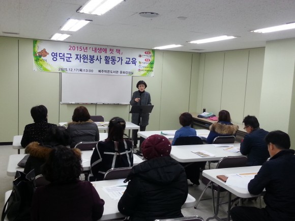 |  | | | ⓒ (주)영남도민일보 | | [영남도민일보] 홍인환 기자 = 영덕군(군수 이희진) 예주작은도서관은 지난 17일 오후 1시 예주문화강좌실에서 관내 어린이집원장 및 군내 도서관 담당 공무원 등 20여명이 참여한 가운데 ‘내 생애 첫 책 지원 사업’ 자원봉사자로 활동을 위한 교육을 개최했다.